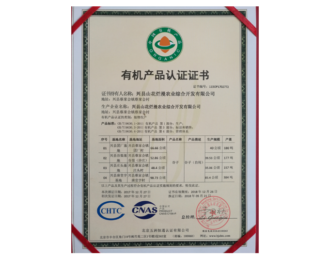 • 有機產品認證證書